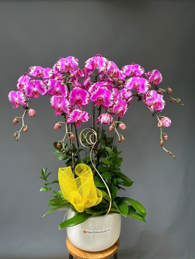 Những cành lan hồ điệp với màu sắc rực rỡ như trắng tinh khôi, vàng ấm áp, hoặc tím quý phái được sắp xếp tinh tế, tạo nên một tổng thể hài hòa và đẳng cấp. Chậu lan không chỉ là quà tặng mà còn là vật trang trí hoàn hảo cho không gian sống và làm việc.